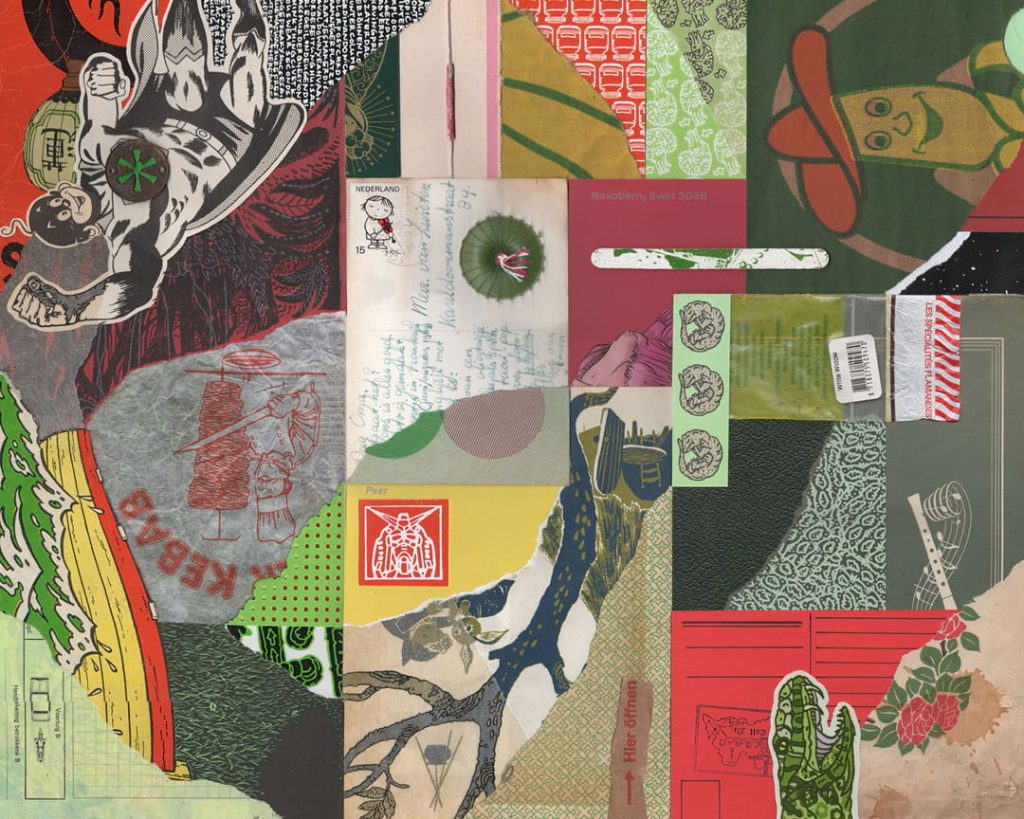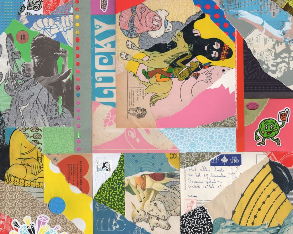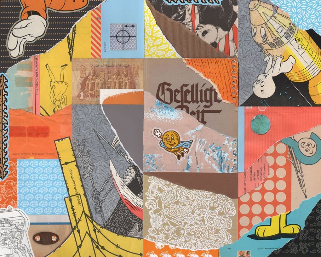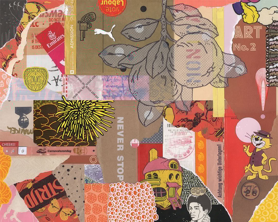 His drawings are a composition of fragments converted from comics, video games, lyrics, letters, and patterns. Most recent is his mixed-mediawork.