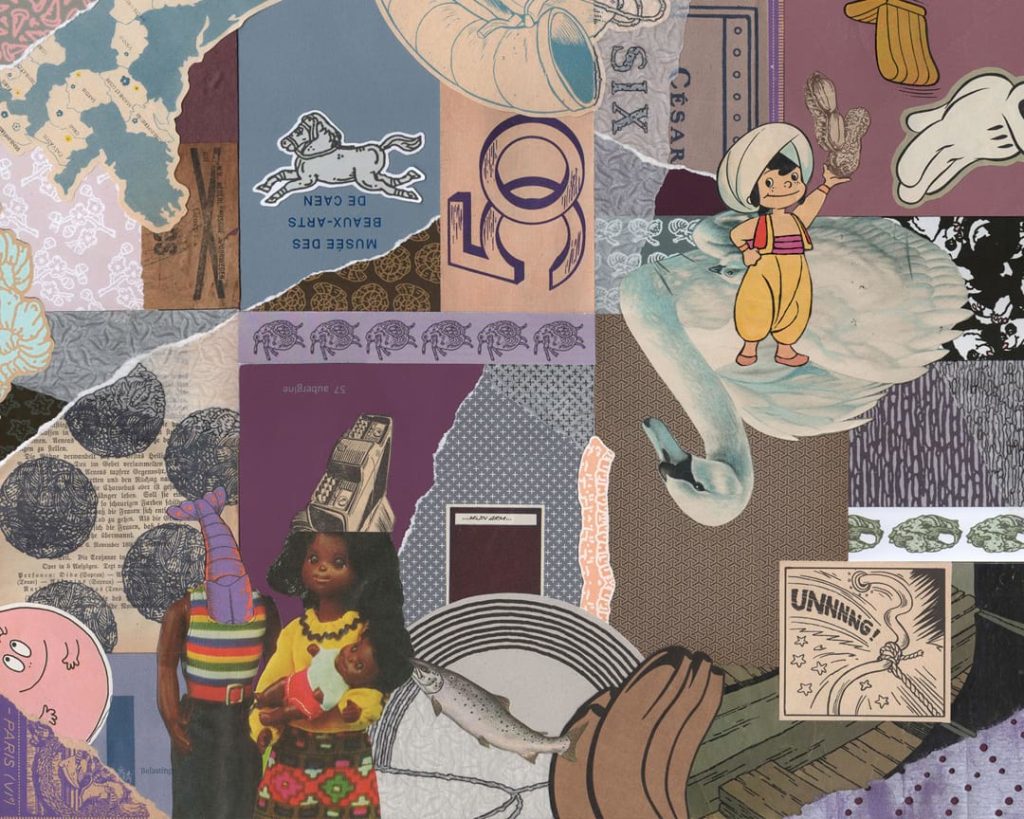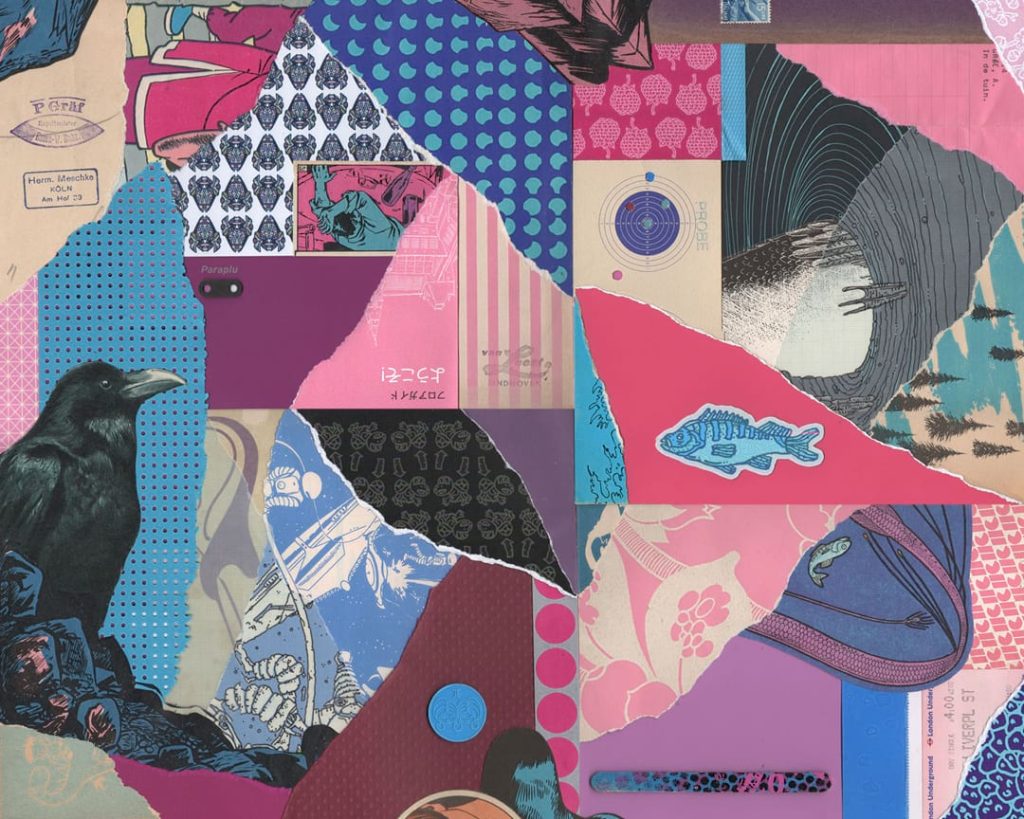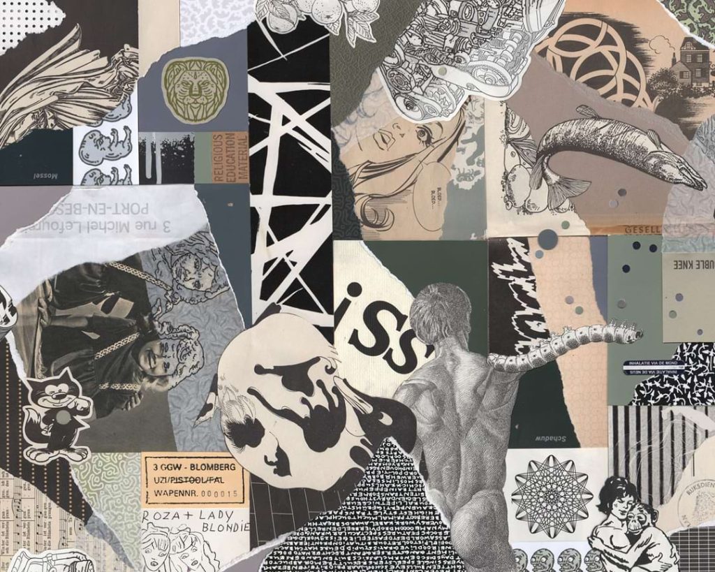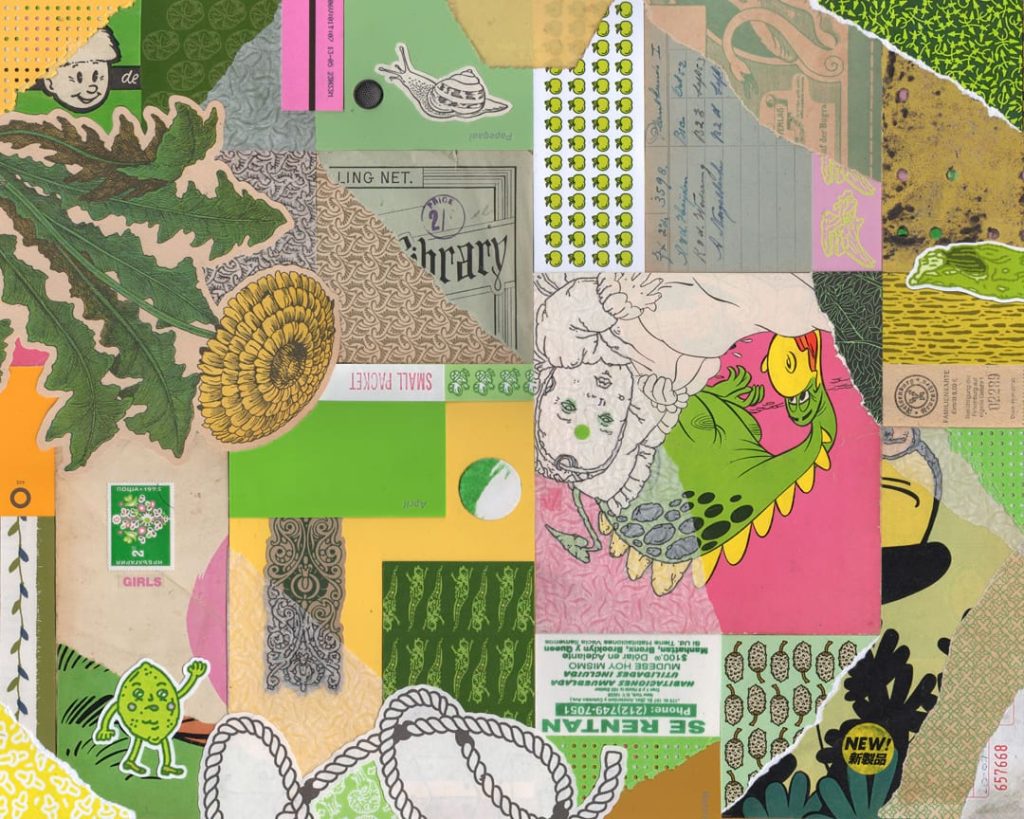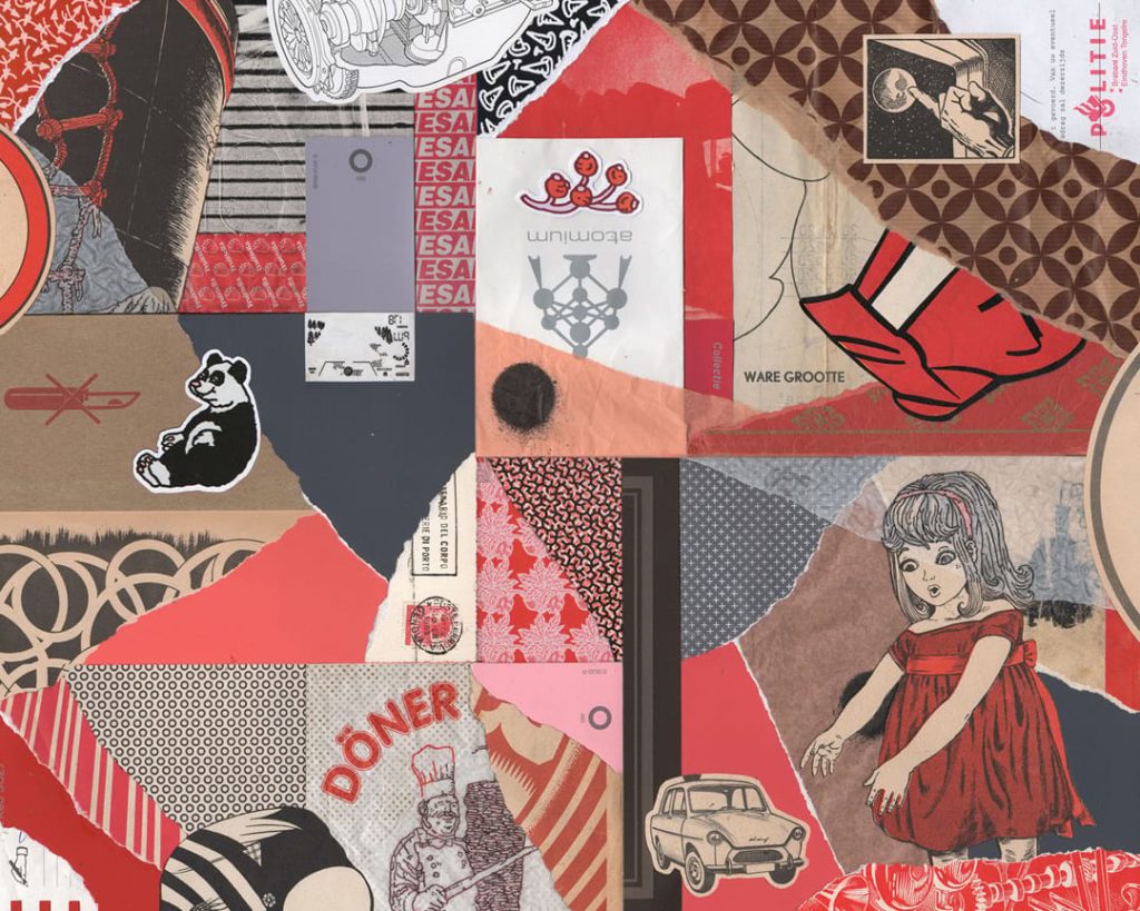 His drawings are a composition of fragments converted from comics, video games, lyrics, letters, and patterns. Most recent is his mixed-mediawork.