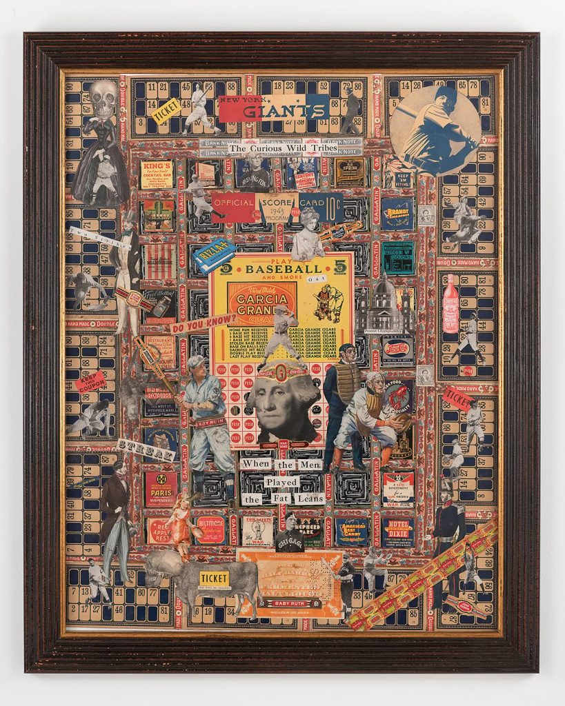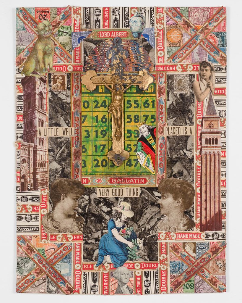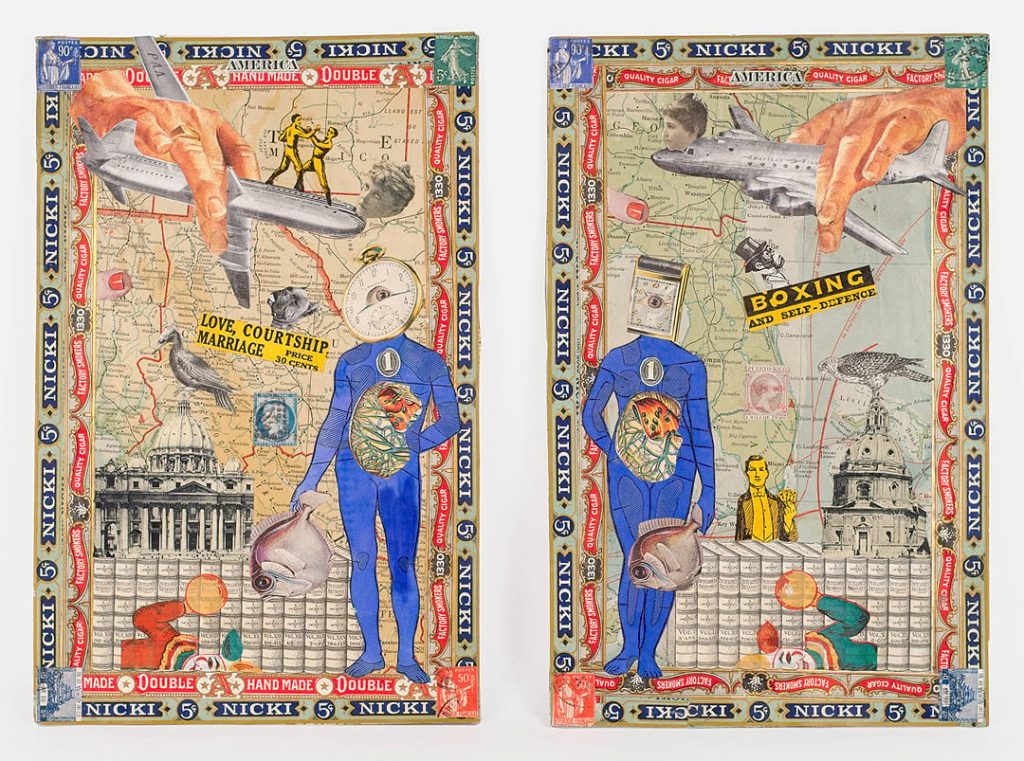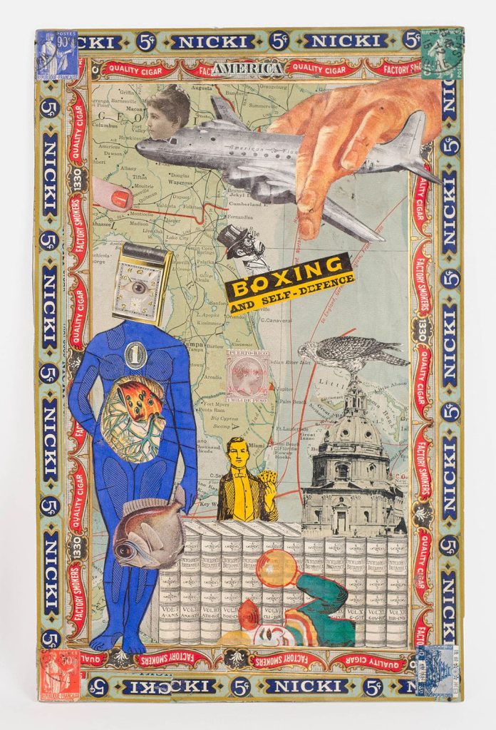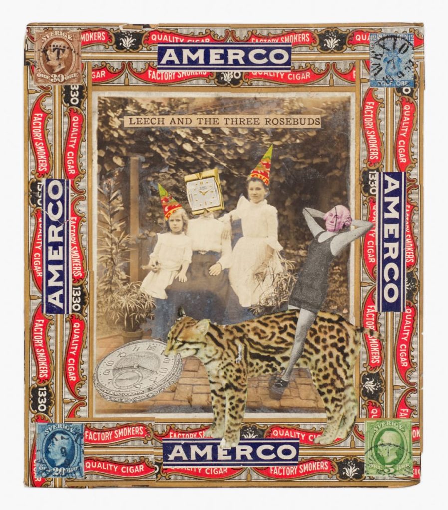 A self-appointed “artist, healer, and man,” Felipe Jesús Consalvos worked for much of his life as a cigar roller, and he extrapolated the vernacular tradition of cigar band collage to a sophisticated practice. The Havana-born artist immigrated to Miami around 1920, eventually settling in New York and then Philadelphia. His obsessive body of work—over 750 surviving collages on paper, found photographs, musical instruments, furniture, and other unexpected surfaces—was discovered in 1980 at a West Philadelphia garage sale. Consalvos’ practice parallels and in some cases prefigures certain contemporaneous developments in Surrealist, Dada, and Futurist and Pop collage, and even poetry. His collages share the biting socio-political satire and absurdist impulse of Dadaists like Kurt Schwitters and Max Ernst, along with abstruse mysticism. (from editor)