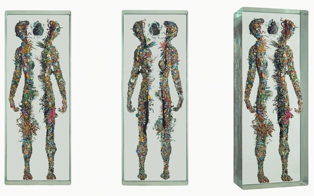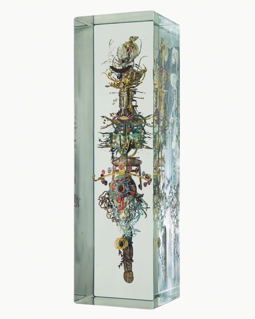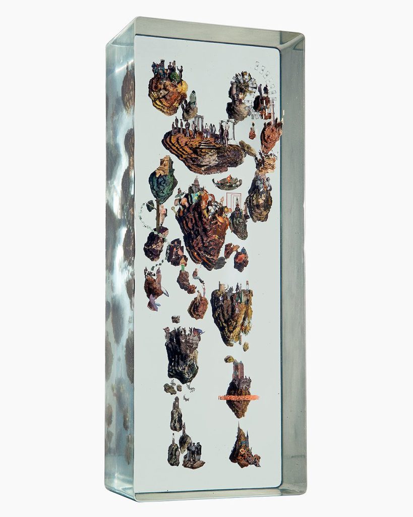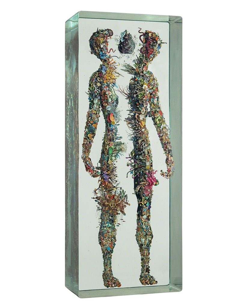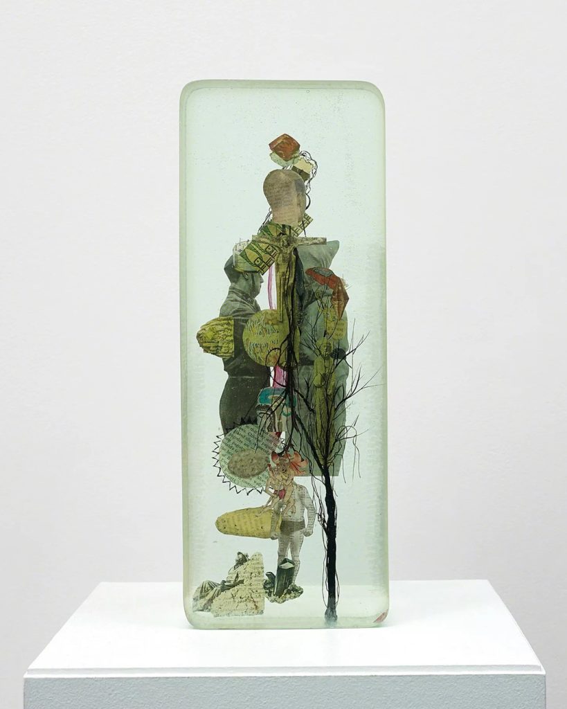 Dustin Yellin describes his inventive sculptures as works of “frozen cinema.” He embeds streaks of paint and a riot of tiny images snipped from old magazines, art history books, encyclopedias, dictionaries, and found notebooks into sheets of laminated glass. The collage elements coalesce into intricate, shape-shifting narrative scenes, human figures, or isolated natural forms. Yellin’s sculptures can feel once contemporary and ancient, like fossilized organisms preserved in amber. (from editor)